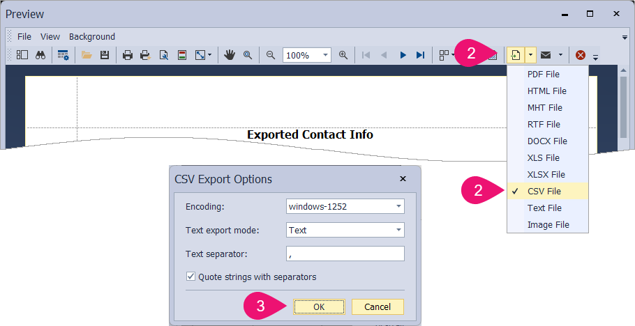 - Under the Format section, select either Email, Phone, or Address for the type of data you'd like to export.