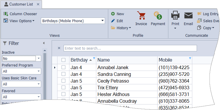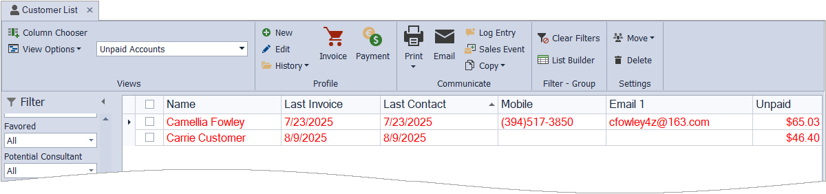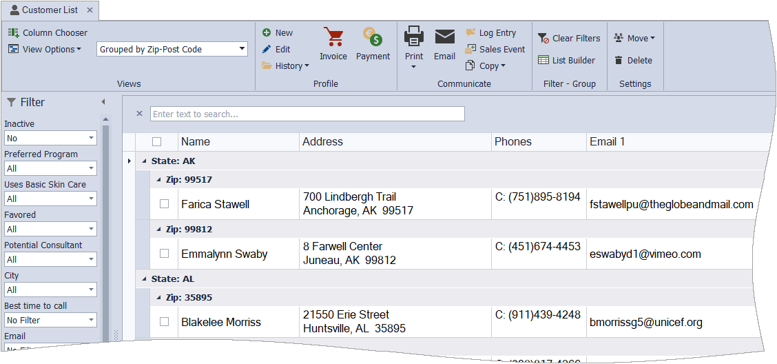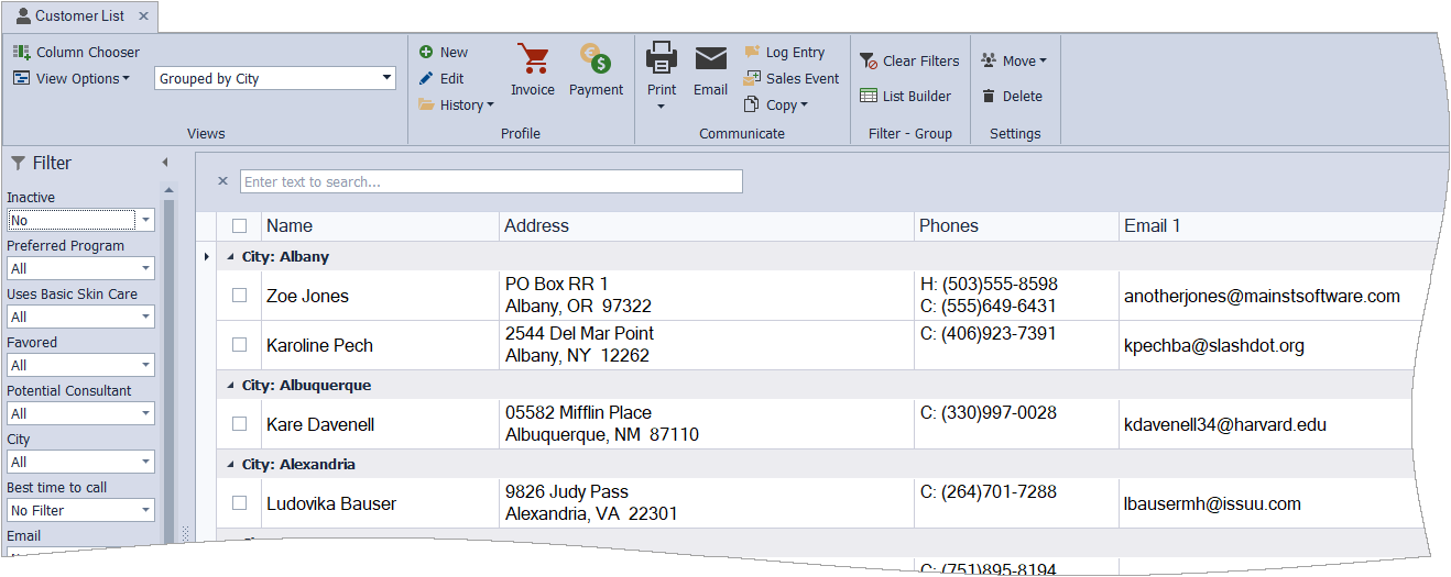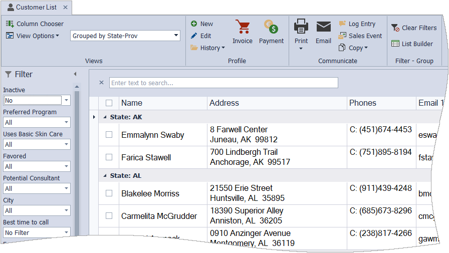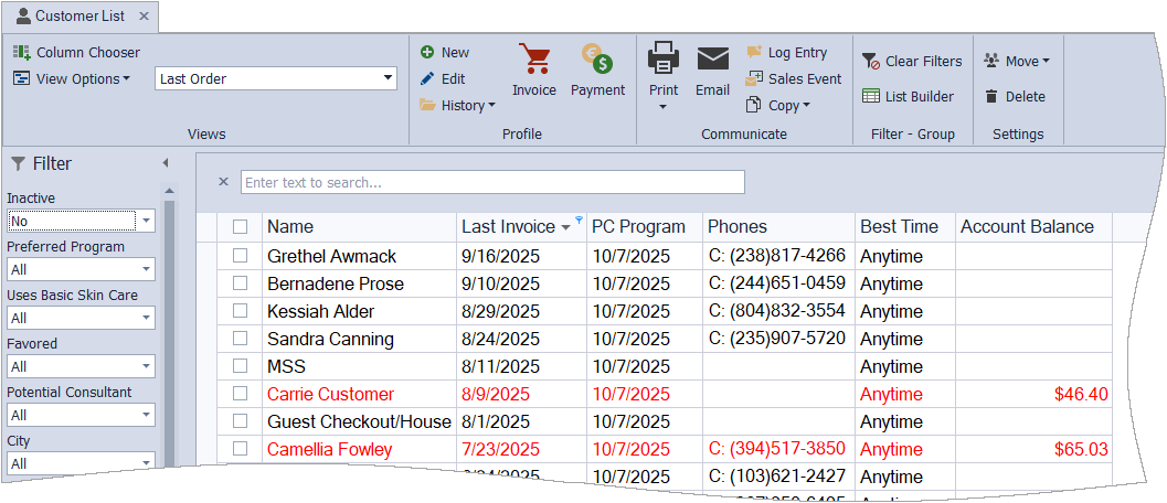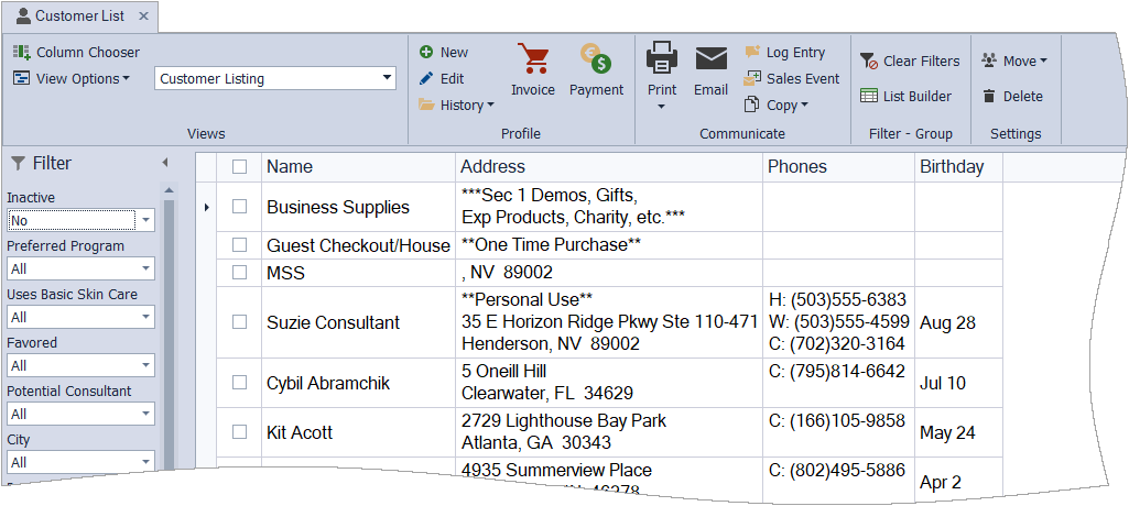 Views enable you to display information in a customizable format. Each list—Customers, Addresses, Units, Products, and the Invoice Log—comes with predefined views. You can also load additional views and customize them to suit your specific needs.
