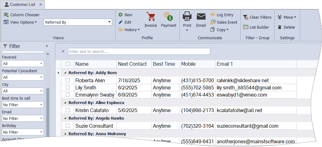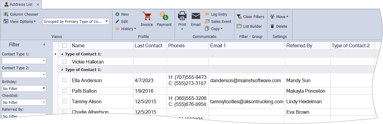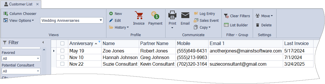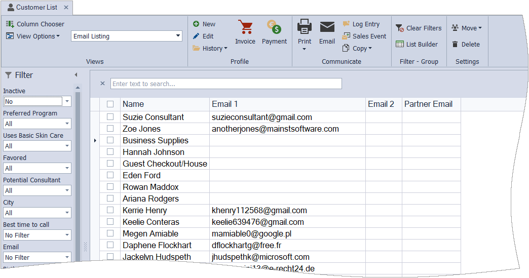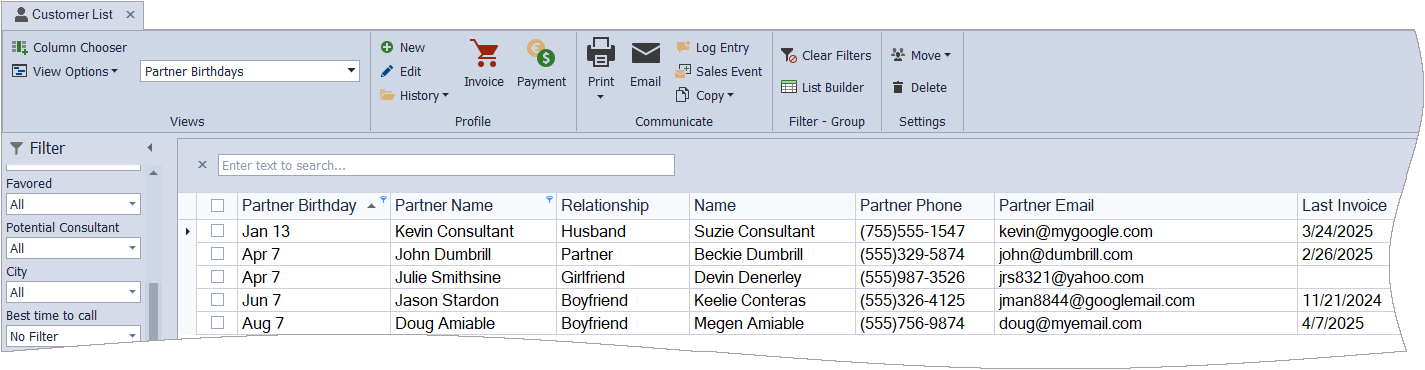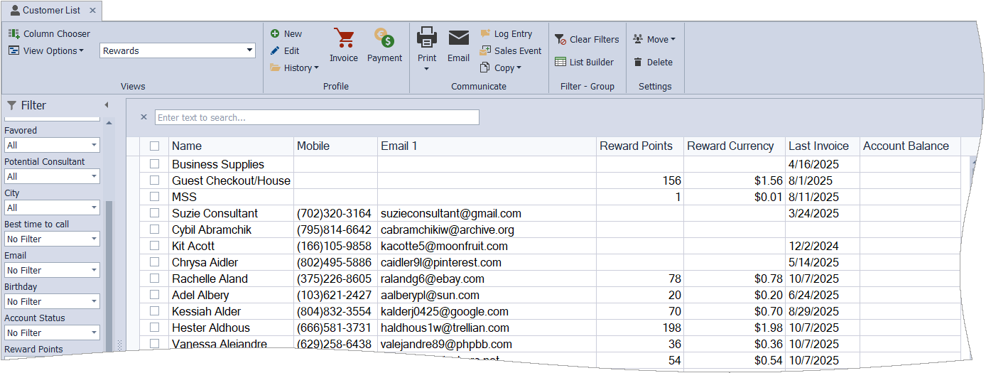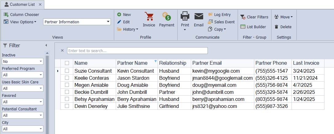 Views enable you to display information in a customizable format. Each list—Customers, Addresses, Units, Products, and the Invoice Log—comes with predefined views. You can also load additional views and customize them to suit your specific needs.