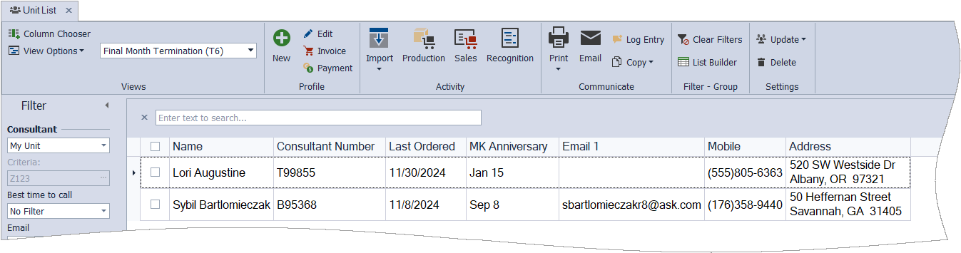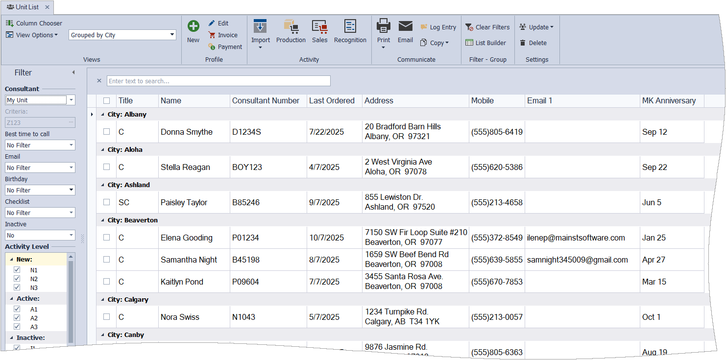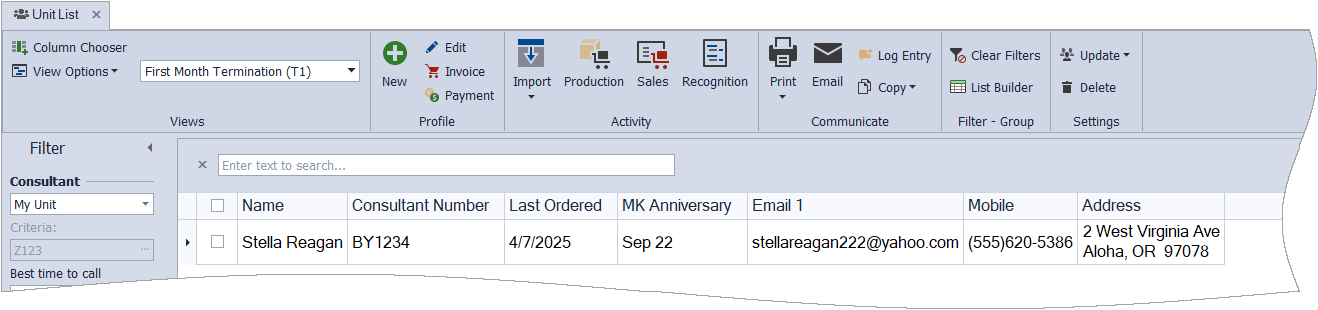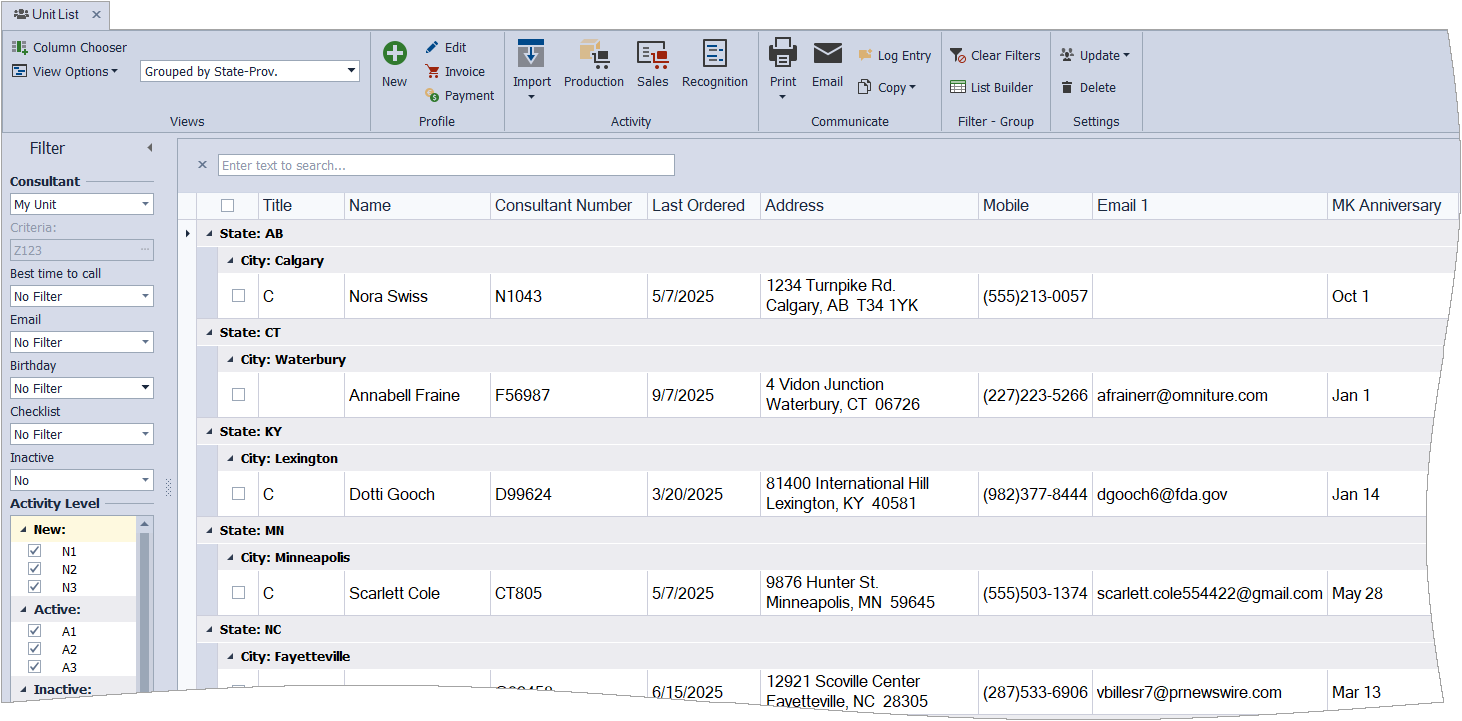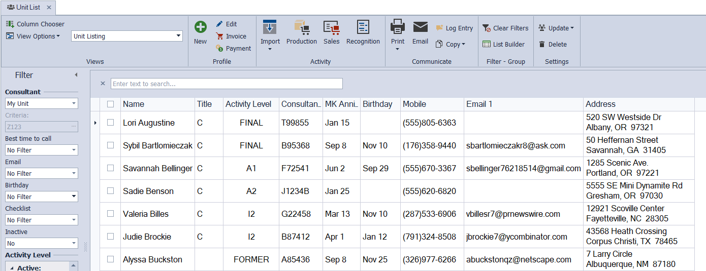 Views allow you to display the information of your choice selected from the available profile fields in a format that allows for further customization (such as sorting, filtering, etc.) and allows you to print. Each list—Customers, Addresses, Units, Products, and the Invoice Log—comes with predefined views. You can also load additional views and customize them to suit your specific needs.
