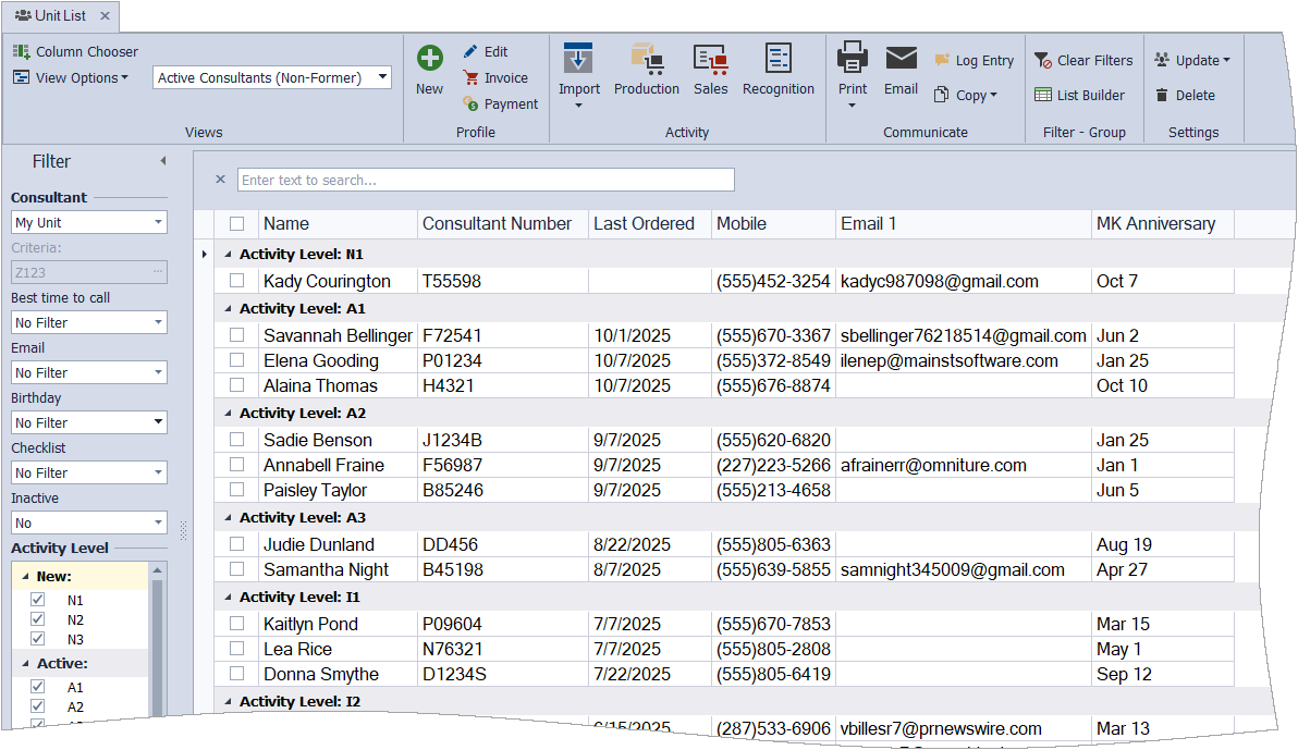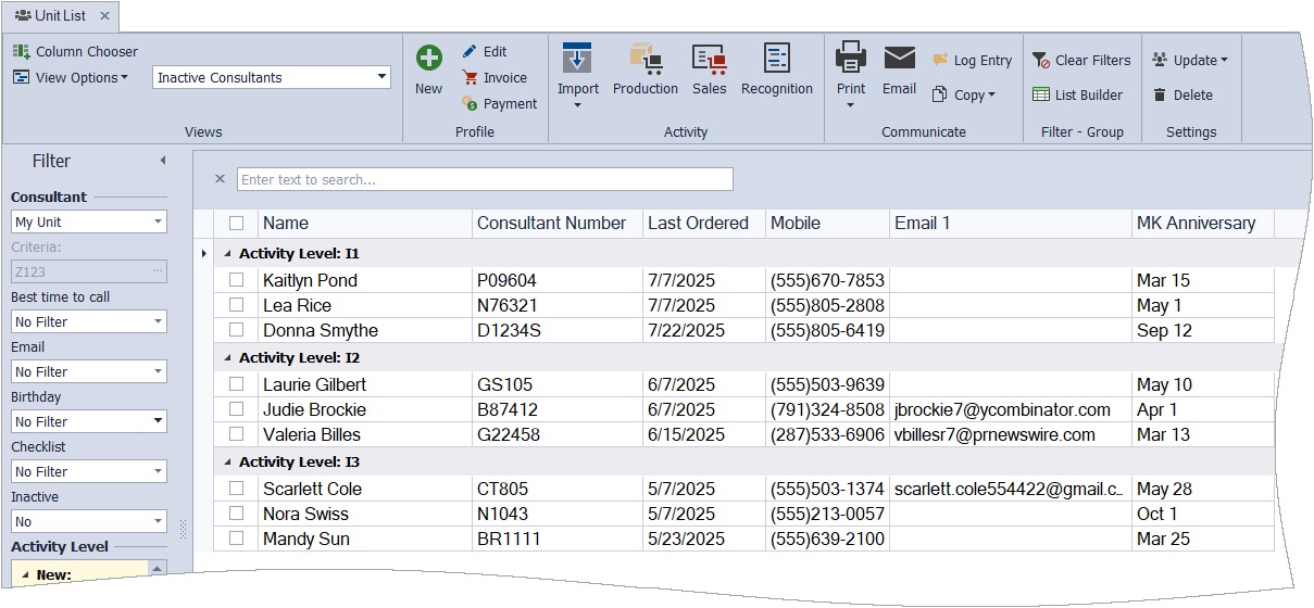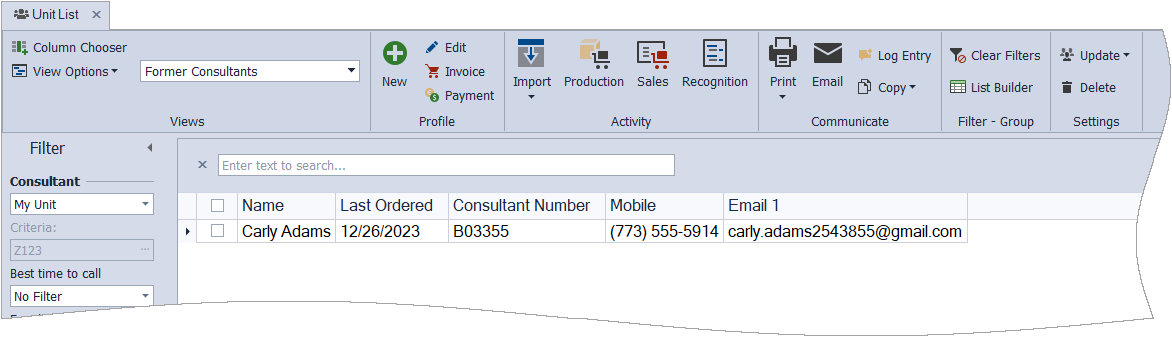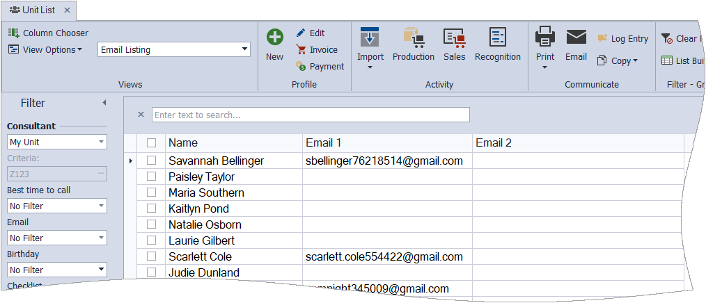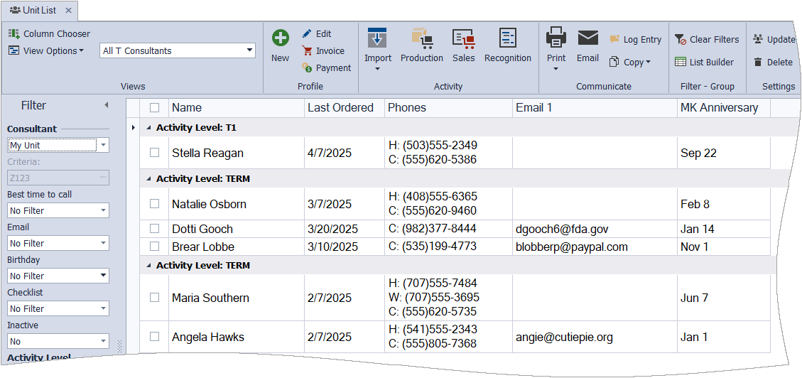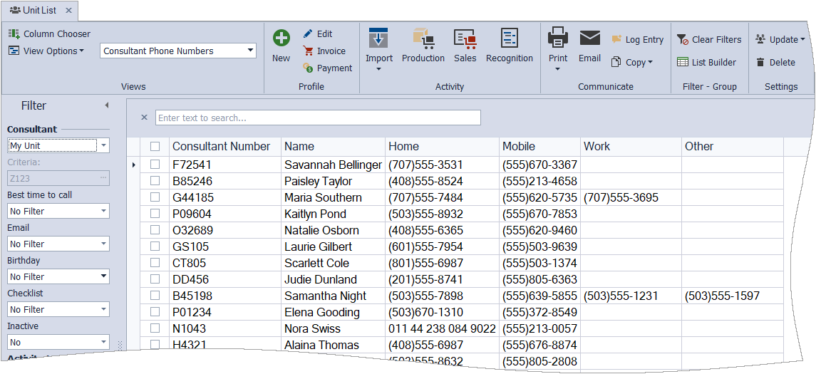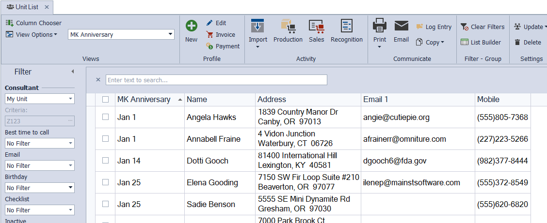 Views allow you to display the information of your choice selected from the available profile fields in a format that allows for further customization (such as sorting, filtering, etc.) and allows you to print. Each list—Customers, Addresses, Units, Products, and the Invoice Log—comes with predefined views. You can also load additional views and customize them to suit your specific needs.