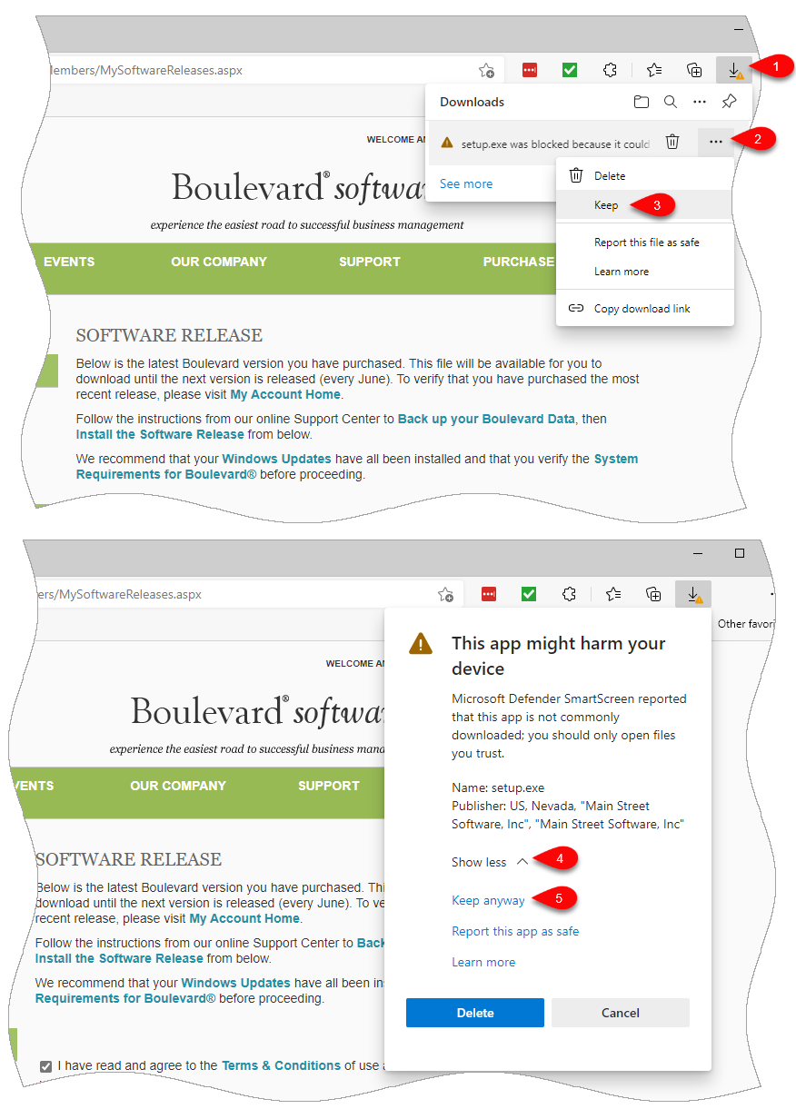 If Microsoft Edge blocks the Boulevard setup file and displays a “This app might harm your device” warning, the file can still be downloaded by choosing to keep it. Edge provides an option in the Downloads panel to override the warning so the installer can run. Once the file is kept, you can proceed with the installation as usual.